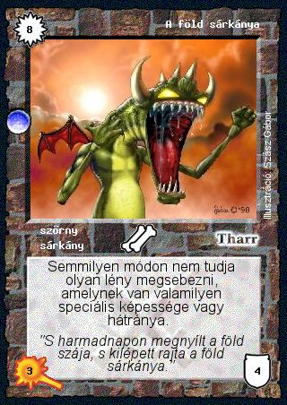 Kiadás: Árnyékhold, Túlélők Földje Gyakoriság: ritka Lapszín (isten): Tharr Típus: szörny Altípus: sárkány Szöveg: Semmilyen módon nem tudja olyan lény megsebezni, amelynek van valamilyen speciális képessége vagy hátránya. Szinesítő szöveg: "S harmadnapon megnyílt a föld szája, s kilépett rajta a föld sárkánya." Illusztráció: Szász Gábor