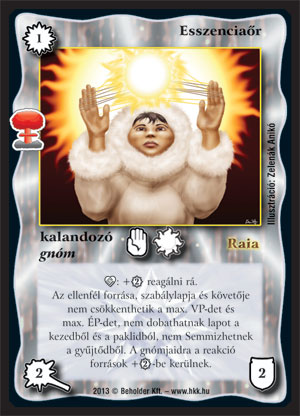 Kiadás: Világégés Gyakoriság: nem gyakori Lapszín (isten): Raia Típus: kalandozó Altípus: gnóm Szöveg: _etnikum: +2_VP reagálni rá. Az ellenfél forrása, szabálylapja és követője nem csökkenthetik a max. VP-det és max. ÉP-det, nem dobathatnak lapot a kezedből és a paklidból, nem Semmizhetnek a gyűjtődből. A gnómjaidra a reakció források +2_VP-be kerülnek. Illusztráció: Zelenák Anikó