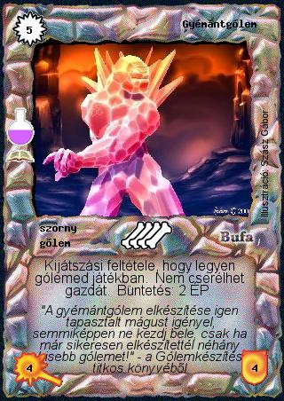 Kiadás: Enkala laboratóriuma (Zén) Gyakoriság: ritka Lapszín (isten): Bufa Típus: szörny Altípus: gólem Szöveg: Kijátszási feltétele, hogy legyen gólemed játékban. Nem cserélhet gazdát. Büntetés: 2 ÉP. Szinesítő szöveg: "A gyémántgólem elkészítése igen tapasztalt mágust igényel, semmiképpen ne kezdj bele, csak ha már sikeresen elkészítettél néhány kisebb gólemet!" - a Gólemkészítés titkos könyvéből Illusztráció: Szász Gábor