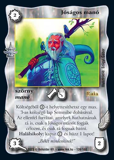 Kiadás: Császárváros Gyakoriság: nem gyakori Lapszín (isten): Raia Típus: szörny Altípus: manó Szöveg: Költségéből 2_VP-t helyettesíthetsz egy max. 3-as költségű lap Semmibe dobásával. Az ellenfél forrásai, amelyek hathatnának rá is, csak a Jóságos manót fogják célozni, és csak rá fognak hatni. Halálsikoly: kapsz 1_VP és húzz 1 lapot! Szinesítő szöveg: "Békét mindenkinek!" Illusztráció:
