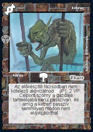 | (AK25) A Ketreccel passzivizálom az ellenfelem Móleonját, majd az én körömben aktivizálom, és passzivizálom vele a Mirgjét, így az ő körében a Ketrec már ismét passzív. Aktivizálódik-e a Móleon, az előkészítő fázisában? A Ketrec szövege egy kicsit pontatlan. A leírt esetben igaz, hogy a Ketrec passzív az ellenfél előkészítő fázisában, így a Ketrec szövege szerint a Móleon nem aktivizálódna, de a Ketrec helyes használati módja a következő: csak addig tart fogva valakit, míg a Ketrec gazdája ismét aktivizálja a Ketrecet. Ekkor a Ketrec hatása megszűnik, a lény szabadon aktivizálódhat. A fenti példánál maradva: az előkészítő fázisban a Móleon aktivizálódik, de a Mirg nem. |