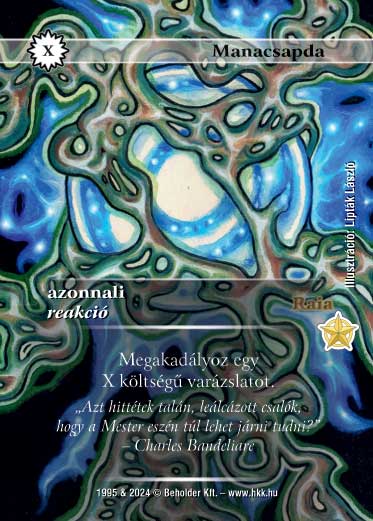 | (AK18) Az azonnali reakció varázslatok előbb létrejönnek mint az a varázslat amire reagálnak (ld. Ellenvarázslat, Manacsapda). Tehát ha a Déja vumet, vagy a Tudati vitalizációmat manaégetik, akkor először végrehajtódik a Manaégés, azután gyógyulsz a vitalizációtól vagy jön a Déja vu. | | (AK19) A Destabilizátor azokra az azonnali varázslatokra hat, melyek szövegében szerepel a "közvetlenül azután játszhatod ki" szöveg (Az elme fölénye, Ellenvarázslat, Manacsapda, Agybénítás, Manaégés, Dornodon visszavág, Rughar dilemmája, Ő a kegyencem, Azt mondtam, nem (ultraritka)), melyeket közvetlenül az ellenfél húzási fázisa után is ki lehet játszani (Passzivitás, Tudatrombolás, Elzárás), valamint A gyenge erejére és a Negációra, ha ez utóbbi kettőt reakcióként használják. | | (AK2) Egy lap idézési költségének a bal felső sarokba írt számot kell tekinteni, de ha a szöveg alapján - a hatás erősségétől függően - további VP-t kell még költeni, ez szintén beletartozik az idézési költségbe. Pl. az Azonnali gyógyítás és Jégcsóva idézési költsége nem 2, hanem 2 plusz annyi, amennyi VP-t pluszban elköltünk. Ez főként a Manaégésnél és a Manacsapdánál lehet fontos. Ha egy lap csökkenti az idézési költséget (Zan-indukátor) vagy növeli (Agyzavarás) akkor az így módosított idézési költséget kell figyelembe venni. | | (AK2) Ha célpont varázslat szörnykomponensből jön ki (pl. Megvesztegetés), akkor is lehet manacsapdázni. Ekkor a Manacsapda költsége annyi VP, ahány szörnykomponens volt az eredeti varázslat költsége. | | (AK23) A Földanya amulettjével az azonnali reakció lapokat lehet eldobatni. A harmadik kiadástól kezdve lettek megkülönböztetve az azonnali reakció lapok, így ebben a kiadásban már az Agybénításra, Manacsapdára, Az elme fölényére, a Jellemtükörre és a Manaégésre rákerült az, hogy azonnali reakció. Rajtuk kívül azonnali reakció még a Dornodon visszavág (itt nem szerepel ugyan a lapon, de a Chara-din visszatér megjelenésekor még nem volt ilyen varázslatkategória), az Ő a kegyencem és az Azt mondtam, nem. A gyenge ereje és a Negáció csak akkor változik reakció lappá, amikor kijátszásra kerülnek, ezek nem azonnali reakció lapok, tehát nem lehet őket eldobatni. | | (AK37) Reakció lapok: Ha az ellenfelem kijátszik egy Sötét halált, én ellenvarázsolom, ő feláldozza Maigner Lopotomosát és hatástalanítja az én ellenvarázslatomat, akkor én még ellenvarázsolhatom az eredeti Sötét halált. Ilyenkor még bármilyen reakciólapot ki lehet játszani az eredeti varázslatra. Sőt, a következő trükk is működik: Az ellenfél Sötét halálját ellenvarázsolom, ő agybénítja, én ismét ellenvarázsolom, ő is ellenvarázsolja, és nekem már csak 2 VP-m és Manacsapdám van, ezért az agybénítását manacsapdázom. | | (AK37) Ha az ellenfelem kijátszik egy Sötét halált, én ellenvarázsolom, ő feláldozza Maigner Lopotomosát és hatástalanítja az én Ellenvarázslatomat, akkor én még ellenvarázsolhatom az eredeti Sötét halált. Ilyenkor még bármilyen reakciólapot ki lehet játszani az eredeti varázslatra. Sőt a következő trükk is működik: Az ellenfél Sötét halálját ellenvarázsolom, ő agybénítja, én ismét ellenvarázsolom, ő is ellenvarázsolja, és nekem már csak 2 VP-m és Manacsapdám van, ezért az Agybénítását manacsapdázom. | | (AK4) Megkülönböztetünk alap és módosított idézési költséget. Egy lapnak az alap idézési költsége az a szám, amely a bal felső sarkába van írva. Amennyiben itt ? vagy X szerepel, illetve a kártya szövege szerint a bal felső sarokba írt számon kívül még további VP-t kell elkölteni, akkor az alap idézési költség a megfelelő behelyettesített érték. Ha a lap nincs játékban (a gyűjtőben, a pakliban, vagy a kézben van), akkor az X-et illetve a pluszban költendő VP-t nullának kell számolni. A ?-nél pedig a lehető legkisebb érték (pl. Tolvajszemnél 1). A módosított idézési költség az alap idézési költségnek játékban levő lapokkal módosított értéke. Ilyen lap lehet pl. egy templom, A béke erdeje, Agyzavarás. A legtöbb idézési költséget említő lap az alap idézési költségre vonatkozik. Néhány kivétel van, mint például a Manacsapda: ha mondjuk kint van egy Sheran temploma, és valaki kijátszik egy Tűzesőt 7+1 VP-ért, a Manacsapdára a módosított idézési költséget (8-at) kell elkölteni, és a templom miatt a Manacsapda idézési költsége eggyel nagyobb, tehát összesen 9-be fog kerülni. Példa az alap idézési költségre: kint van egy Zan-indukátor, kezemben van egy Azonnali gyógyítás. Amíg az Azonnali gyógyítás a kezemben van, addig az alap idézési költsége 2. Kijátszom, gyógyítok 3 ÉP-t, tehát 5 VP-t kell költenem: a kijátszás pillanatában tehát az Azonnali gyógyításom alap idézési költsége 5. A Zan-indukátor miatt eggyel kevesebb VP-t kell költenem, tehát a módosított idézési költség 4. (Figyelem: a Zöldellő fa az idézési költséget nem befolyásolja, csak a varázslat hatását!) | | (AK5) és (AK15) Ha Zöldellő fád van játékban, minden, gyógyító varázslatra költött VP-d duplán számít. Tehát egy 4-et gyógyító azonnali gyógyítás 3 VP-be kerül, egy Hódolat Raiának 2 VP-be kerül stb. Ilyenkor ezt a kevesebb VP-t kell a módosított idézési költségnek tekinteni, tehát a Manacsapdázása is fele VP-be kerül. | | (AK62) Öt varázspontért Manacsapdázhatom a Megszakítást akkor is, ha lapot dobott hozzá az ellenfél, mivel a Megszakítás idézési költsége ennyi. | | (AK63) A Lélekcsapda, a Manacsapdához hasonlóan, a módosított idézési költségre vonatkozik. | | (AK64) Az ellenállás megtörését játszom ki, amire az ellenfél Agybénítással reagá