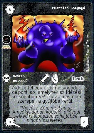Kiadás: Árnyékvilág (Zén) Gyakoriság: ritka Lapszín (isten): Leah Típus: szörny Altípus: motyogó Szöveg: Áldozd fel egy aktív motyogódat: célpont lap, amelynek az idézési költségében VP-n kívül más nem szerepel, a gyűjtőbe kerül. Szinesítő szöveg: "Vigyázz, Zén, mert ha az Árnyékvilágban kóborló, eltévedt lelked is elpusztul, soha többé nincs visszatérés." Illusztráció: Fischer Tamás