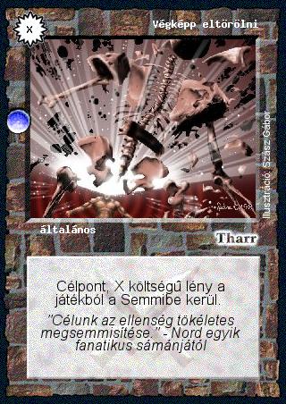 Kiadás: Árnyékhold, Túlélők Földje Gyakoriság: ritka Lapszín (isten): Tharr Típus: általános Szöveg: Célpont, X költségű lény a játékból a Semmibe kerül. Szinesítő szöveg: "Célunk az ellenség tökéletes megsemmisítése." - Nord egyik fanatikus sámánjától Illusztráció: Szász Gábor