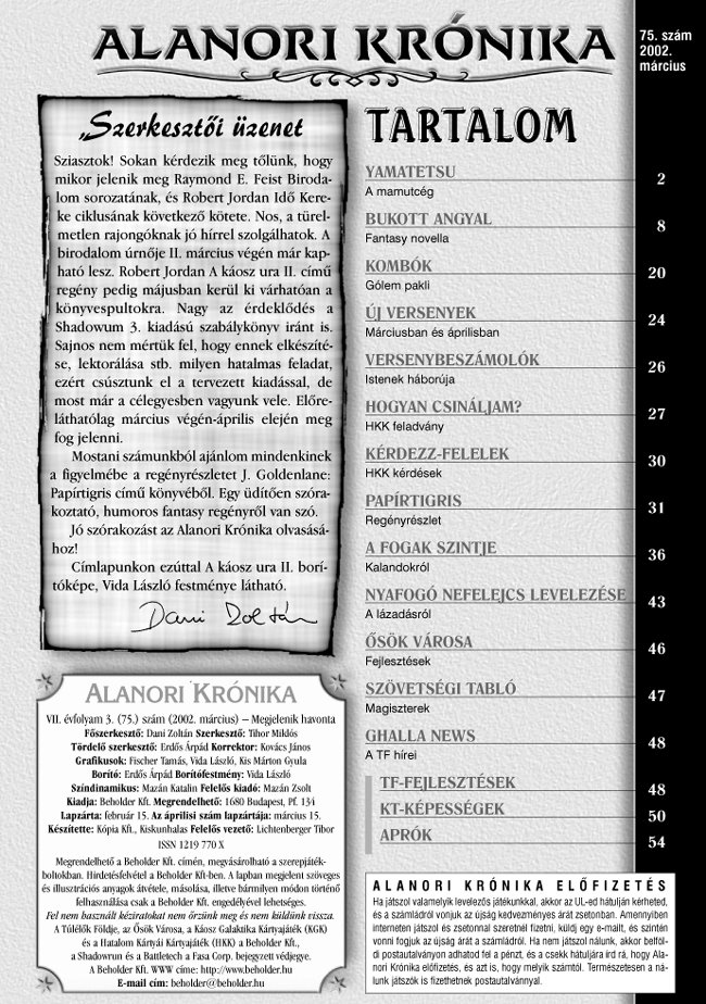 Alanori Krónika 75. (2002. március) - Tartalomjegyzék