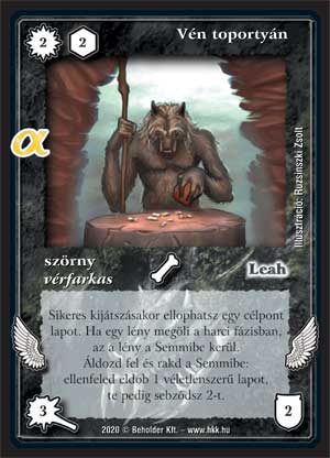 Kiadás: Alfa pakli – Vérfarkasok Gyakoriság: ritka Lapszín (isten): Leah Típus: szörny Altípus: vérfarkas Szöveg: Sikeres kijátszásakor ellophatsz egy célpont lapot. Ha egy lény megöli a harci fázisban, az a lény a Semmibe kerül. Áldozd fel és rakd a Semmibe: ellenfeled eldob 1 véletlenszerű lapot, te pedig sebződsz 2-t. Illusztráció: Ruzsinszki Zsolt
