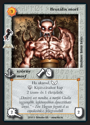 Brutális morf (8): Mint az új morfok nagyobb része, ez is jól sikerült papír. Bármilyen etnikumnak adhat egy kis ütőerőt ez a 3 zanszilánkért 4/4-es, izmos, életes srác. Legjobb persze azokhoz, ahol amúgy is rámegyünk az ütésre, pl. Keltetős (vagy anélküli) Chara-din követősbe. A nem-repülés is itt lesz néha hasznos, ha nincs plusz 1 VP-nk rá. Az etnikumokon kívül bármilyen pakliba beférhet, ami játszik lényekkel, hiszen csak mutatnunk kell neki egy altípusos lényt, és máris kapja a tápot. A 3 zanszilánk mondjuk egy Villámháborús-olcsó lényes pakliban sokkal jobb, mint a 3 VP, pl. 1 VP-nél ellenfél körében Sötétségszellem + Brutális morf.