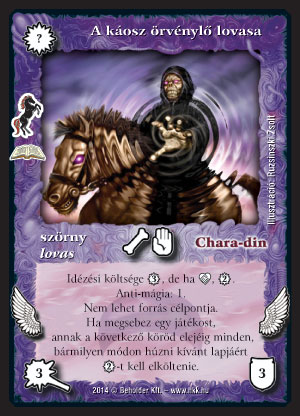 A káosz örvénylő lovasa (8): Ha van mellette lovasod, a második körben kettőért kiröppen, nehéz counterelni és leszedni, ha beüt, az ellenfél rosszul jár. (Vegyük észre, hogy a normál húzásáért is fizetnie kell!) Ha mi kezdünk, majdnem minden ellen jó, és kevés lényes pakli ellen kb. mindig jó, hiszen ott könnyebb beütni. Más lényes paklikba is használhatónak érzem, 3-ért is szívesen beütnék vele a második körben. Persze nem árt, ha a leütéstől kicsit megvédjük, Chara-din követője, vagy a Brutális morf (ld. nemsokára) például segíthet ebben is.