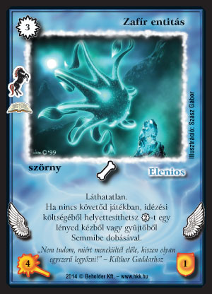 Zafír entitás (7): A Kragorus paklik egyik alapproblémája, főleg a sok mágikus védelmű lénnyel játszóké, hogy ha leszedik a követőt, lecsoffad a pakli. Ezt már korábban is segítettük lapokkal, pl. G'inyob vagy Remira kedvence jól jöhet ilyenkor. A zafír entitás is tökéletes erre a célra, elsősorban a Járj nélküli verzióban (például jó kis lépéselőnyös Kragoru horda-kontrollt láttam), mivel ott mindenképp 1-ért tud jönni, de azért a Járjasba is jól beférhet. Máshová viszont nehezen tudom elképzelni.