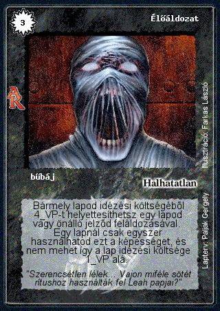 Kiadás: Alanori Krónika Gyakoriság: ritka Lapszín (isten): Halhatatlan Klán Típus: bűbáj Szöveg: Bármely lapod idézési költségéből 4 VP-t helyettesíthetsz egy lapod vagy önálló jelződ feláldozásával. Egy lapnál csak egyszer használhatod ezt a képességet, és nem mehet így a lap idézési költsége 1 VP alá. Szinesítő szöveg: "Szerencsétlen lélek... Vajon miféle sötét rítushoz használták fel Leah papjai?" Illusztráció: Farkas László Tervező: Paljak Gergely