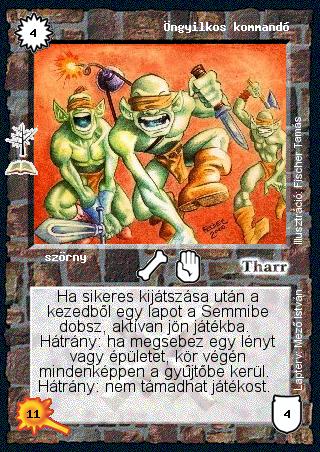 Szöveg: Ha sikeres kijátszása után a kezedből egy lapot a Semmibe dobsz, aktívan jön játékba. Hátrány: ha megsebez egy lényt vagy épületet, kör végén mindenképpen a gyűjtőbe kerül. Hátrány: nem támadhat játékost.