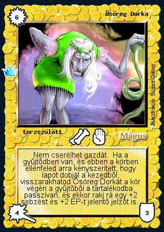 Szöveg: Nem cserélhet gazdát. Ha a gyűjtődben van, és ebben a körben ellenfeled arra kényszerített, hogy lapot dobjál a kezedből, visszarakhatod Ősöreg Dorkát a kör végén a gyűjtőből a tartalékodba, passzívan, és ekkor rakj rá egy +2 sebzést és +2 ÉP-t jelentő jelzőt is.