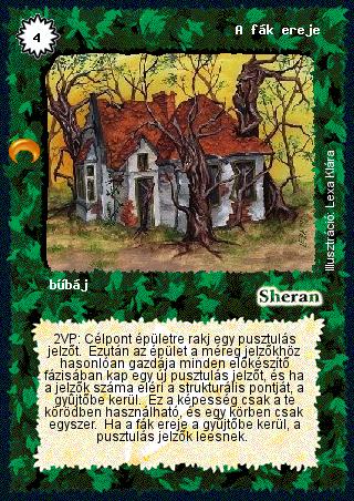 Szöveg: 2VP: Célpont épületre rakj egy pusztulás jelzőt. Ezután az épület a méreg jelzőkhöz hasonlóan gazdája minden előkészítő fázisában kap egy új pusztulás jelzőt, és ha a jelzők száma eléri a strukturális pontját, a gyűjtőbe kerül. Ez a képesség csak a te körödben használható, és egy körben csak egyszer. Ha a fák ereje a gyűjtőbe kerül, a pusztulás jelzők leesnek.