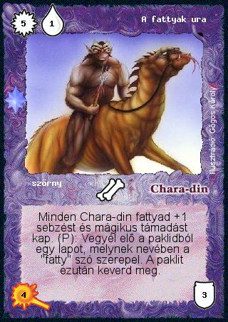 Szöveg: Minden Chara-din fattyad +1 sebzést és mágikus támadást kap. (P): Vegyél elő a paklidból egy lapot, melynek nevében a "fatty" szó szerepel. A paklit ezután keverd meg.
