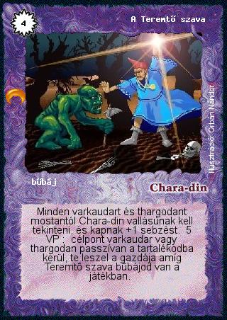 Kiadás: Chara-din visszatér Gyakoriság: nem gyakori Lapszín (isten): Chara-din Típus: bűbáj Szöveg: Minden varkaudart és thargodant mostantól Chara-din vallásúnak kell tekinteni, és kapnak +1 sebzést. 5 VP: célpont varkaudar vagy thargodan passzívan a tartalékodba kerül, te leszel a gazdája amíg Teremtő szava bűbájod van a játékban. Illusztráció: Orbán Nándor