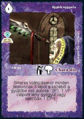 Kiadás: Az illúziók világa (Zén) Gyakoriság: ritka Lapszín (isten): Chara-din Típus: tárgy Szöveg: Sikeres kijátszásakor minden játékosnak 3 lapot a kezéből a gyűjtőbe kell dobnia. (P), 1 VP: célpont lény gyógyul vagy sebződik 1 ÉP-t. Illusztráció: Baross Ferenc