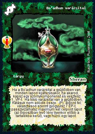 Szöveg: Ha a Bo'adhun varázsital a gyűjtődben van, minden lapod kijátszásakor, ha akarod, kapsz egy szörnykomponenst és vesztesz 1 VP-t. Ha több varázsital van a gyűjtődben, hatásuk nem adódik össze. (P), áldozd fel: választásod szerint gyógyulsz 7 ÉP-t, passzivizálhatsz maximum két célpont lapot (az őrposztban levő lény ilyenkor előbb a tartalékba kerül), vagy húzol egy lapot.