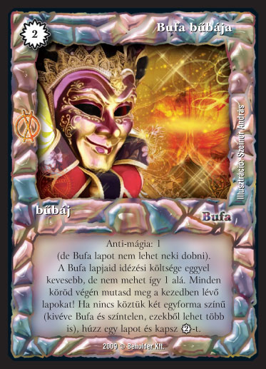 Szöveg: Anti-mágia: 1 (de Bufa lapot nem lehet neki dobni). A Bufa lapjaid idézési költsége eggyel kevesebb, de nem mehet így 1 alá. Minden köröd végén mutasd meg a kezedben lévő lapokat! Ha nincs köztük két egyforma színű (kivéve Bufa és színtelen, azokból lehet több is), húzz egy lapot és kapsz 2_VP-t.