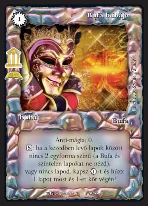 Szöveg: Anti-mágia: 0. (S): ha a kezedben levő lapok között nincs 2 egyforma színű (a Bufa és színtelen lapokat ne nézd), vagy nincs lapod, kapsz 1_VP-t és húzz 1 lapot most és 1-et kör végén!