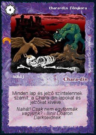 | (AK 30) Egy Chara-din fénykora van játékban. Ilyenkor a kézben levő lapok nem számítanak színtelennek, mivel a játéban levő lapok csak abban az esetben hatnak a kézben levő lapokra, ha ez külön rá van írva a lapra. A kézből kijátszott lapok (pl. azonnali varázslatok) színtelennek számítanak, mert ha egy az asztalon levő lap permanensen hat az összes lapra (átírja a színét, növeli vagy csökkenti idézési költségét stb.), akkor az már a lapok kijátszásakor is érvényesül. Ha A halál maszkját rakok a lényemre, akkor mivel mind A halál maszkja mind a Chara-din fénykora folyamatosan kifejti a hatását, ezért mindig annak a hatása érvényesül, amit később raktak ki. | | (AK11) Ha egy az asztalon levő lap folyamatosan fejti ki a hatását, akkor mindig felülbírálja az egyszeri varázslatokat, hatásokat. Pl. a Chara-din fénykoránál hiába használok Varázsfestéket, vagy Áttérítést, a lap továbbra is színtelen marad. | | (AK15) Általános szabály, hogy ha egy az asztalon levő lap permanensen hat az összes lapra (átírja a színét, drágítja vagy csökkenti a kihozási költséget stb.), akkor az már a kijátszáskor érvényesül. Tehát Chara-din fénykoránál minden kijátszott lap színtelennek számít, míg A teremtő szavánál minden kijátszott varkaudar Chara-din színű lesz. | | (AK15) Általános szabály, hogy ha egy az asztalon levő lap permanensen hat az összes lapra (átírja a színét, növeli vagy csökkenti a kihozási költséget stb.), akkor az már a kijátszáskor érvényesül. Tehát a Chara-din fénykoránál minden kijátszott lap színtelennek számít, ezért ha az asztalon van Chara-din fénykora, a Leah és Dornodon lapokat nem lehet megakadályozni A jóság erejével. | | (AK40) A folyamatosan ható hatások (ilyen pl. a Chara-din fénykora) mindig felülbírálják az egyszerieket. Ha mindkettő egyszeri hatás, akkor az dönt, hogy melyik történik később, vagyis Dálámár színt tud váltani akkor is, ha kapott már jelzőt Raia papnőjétől. |