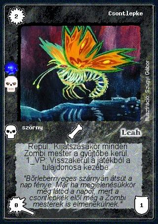 Szinesítő szöveg: "Bőrlebernyeges szárnyán átsüt a nap fénye. Már ha megjelenésükkör még látod a napot, mert a csontlepkék elől még a Zombi mesterek is elmenekülnek."