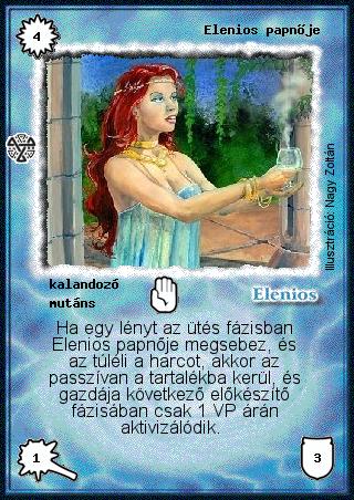 Szöveg: Ha egy lényt az ütés fázisban Elenios papnője megsebez, és az túléli a harcot, akkor az passzívan a tartalékba kerül, és gazdája következő előkészítő fázisában csak 1 VP árán aktivizálódik.