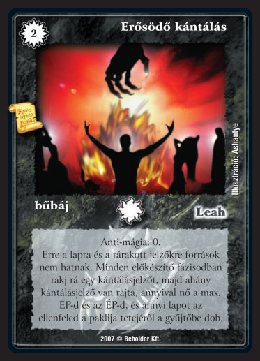 Szöveg: Anti-mágia: 0. Erre a lapra és a rárakott jelzőkre források nem hatnak. Minden előkészítő fázisodban rakj rá egy kántálásjelzőt, majd ahány kántálásjelző van rajta, annyival nő a max. ÉP-d és az ÉP-d, és ennyi lapot az ellenfeled a paklija tetejéről a gyűjtőbe dob.