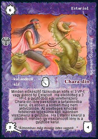 Szöveg: Minden előkészítő fázisodban költs el 3 VP-t, vagy áldozd fel Estariolt. Ha elköltötted a 3 VP-t, a gyűjtődből egy véletlenszerű Chara-din lény passzívan a tartalékodba kerül, és ebben a körben még nem aktivizálódik. Az esetleges kihozási feltételnek teljesülnie kell, különben visszakerül a gyűjtőbe. Ha Estariol kikerül a játékból, minden így visszahozott lény is a gyűjtőbe kerül.
