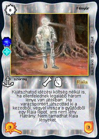 Szöveg: Kijátszhatod idézési költség nélkül is, ha ellenfelednek legalább három lénye van játékban. Ha varázspontért játszottad ki a kezedből, vegyél vissza a gyűjtődből egy Raia lapot, ami nem lény. Hátrány: Nem támadhat Raia lényeket.
