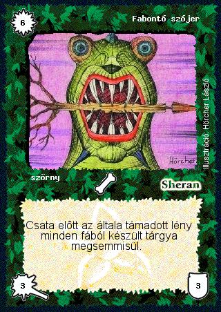 Kiadás: Alappakli, 1. kiadás Gyakoriság: nem gyakori Lapszín (isten): Sheran Típus: szörny Szöveg: Csata előtt az általa támadott lény minden fából készült tárgya megsemmisül. Illusztráció: Hörcher László