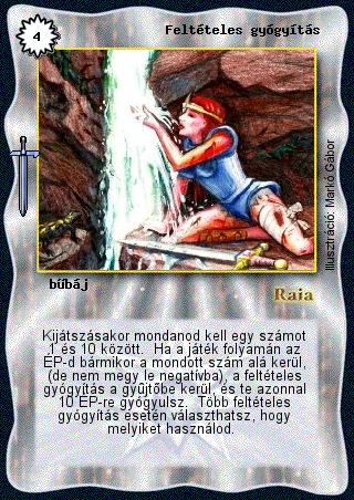Szöveg: Kijátszásakor mondanod kell egy számot 1 és 10 között. Ha a játék folyamán az ÉP-d bármikor a mondott szám alá kerül, (de nem megy le negatívba), a feltételes gyógyítás a gyűjtőbe kerül, és te azonnal 10 ÉP-re gyógyulsz. Több feltételes gyógyítás esetén választhatsz, hogy melyiket használod.