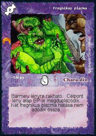 Szöveg: Bármely lényre rakható. Célpont lény alap ÉP-je megduplázódik. Két fregnikus plazma hatása nem adódik össze.