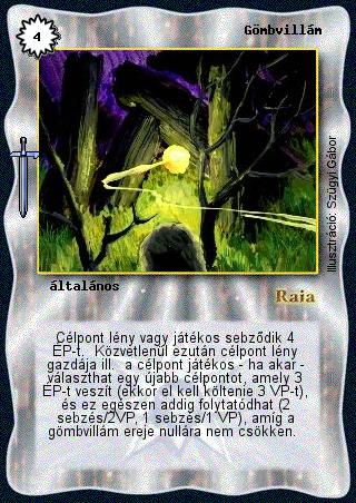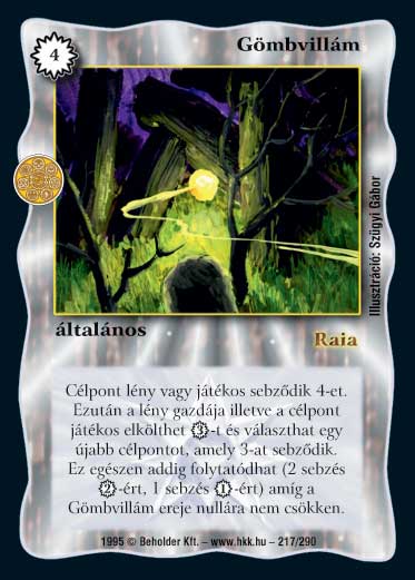 Szöveg: Célpont lény vagy játékos sebződik 4 ÉP-t. Közvetlenül ezután célpont lény gazdája ill. a célpont játékos - ha akar - választhat egy újabb célpontot, amely 3 ÉP-t veszít (ekkor el kell költenie 3 VP-t), és ez egészen addig folytatódhat (2 sebzés/2VP, 1 sebzés/1 VP), amíg a gömbvillám ereje nullára nem csökken.