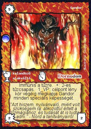Kiadás: Árnyékhold Gyakoriság: ritka Lapszín (isten): Dornodon Típus: kalandozó Altípus: alakváltó Szöveg: Immúnis a tűzre. +: 2-es tűzcsapás. 1 VP: célpont lény kör végéig megkapja Gandor minden speciális képességét. Szinesítő szöveg: "Azt hiszem, nyilvánvaló, miért volt szükségem rá: átkozottul értett a tűzmágiához, és tudását át is tudta adni." - Nord a tanítványairól Illusztráció: