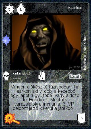 Szöveg: Minden előkészítő fázisodban, ha Haarkon aktív, dobj a kezedből egy lapot a gyűjtőbe, vagy áldozd fel Haarkont. Mentális varázslatokra immúnis. 3 VP: célpont jelző kikerül a játékból.