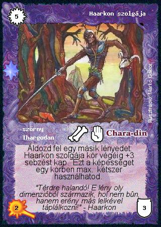 Szöveg: Áldozd fel egy másik lényedet: Haarkon szolgája kör végéig +3 sebzést kap. Ezt a képességet egy körben max. kétszer használhatod.