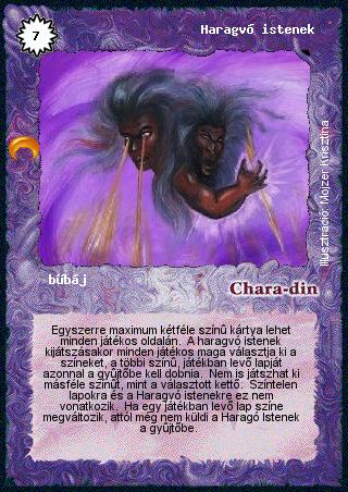Szöveg: Egyszerre maximum kétféle színű kártya lehet minden játékos oldalán. A haragvó istenek kijátszásakor minden játékos maga választja ki a színeket, a többi színű, játékban levő lapját azonnal a gyűjtőbe kell dobnia. Nem is játszhat ki másféle színűt, mint a választott kettő. Színtelen lapokra és a Haragvó istenekre ez nem vonatkozik. Ha egy játékban levő lap színe megváltozik, attól még nem küldi a Haragó Istenek a gyűjtőbe.