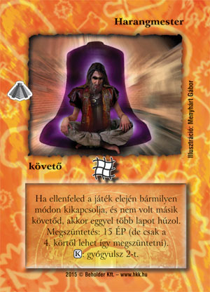 Szöveg: Ha ellenfeled a játék elején bármilyen módon kikapcsolja, és nem volt másik követőd, akkor eggyel több lapot húzol. Megszüntetés: 15 ÉP (de csak a 4. körtől lehet így megszüntetni). (K): gyógyulsz 2-t.