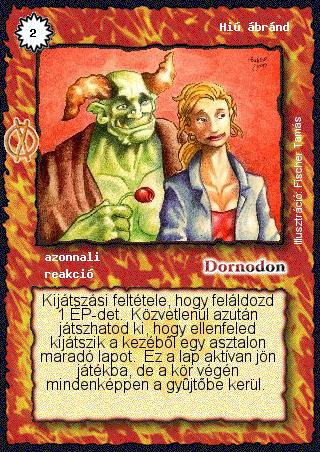 Szöveg: Kijátszási feltétele, hogy feláldozd 1 ÉP-det. Közvetlenül azután játszhatod ki, hogy ellenfeled kijátszik a kezéből egy asztalon maradó lapot. Ez a lap aktívan jön játékba, de a kör végén mindenképpen a gyűjtőbe kerül.