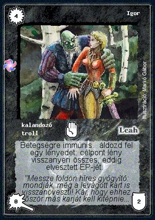 | (AK 30) Neves kalandozók: Alex Vampirsson, Annak, Aquan, Aritma, Arnilla, Asylum, Azbesztagyú Arktisz, Bean-sidhe, Belladonna, Betonfal, Borax király, Caramella, Connor Wartause, Csákányos Blendor, Csala-csíny Csilla, Csillagbajnok, Dálámár, Darkseid, Daronel, Diána, Don Caloni, Dort Amessix, Dögvész, Éjmágus, El Dongo, Eliana, Ervdő, Estariol, Ezeréletű, Fantalas, Flavius, Fullánk, Gandor, Grath Morphus, Gwendolen, Haarkon, Harq al-Ada, Helvir, Higany Hugó, Hófehérke, Hurleon, Ifjabb Lord Kovács, Igazságtevő, Igor, Ithril, Jerikó, Kaporszakáll, Kis Vagabund, Kloin Drungas, Kopernik, Korgó Szikra, Kőfejű Beldor, Kri Wu She, Kyra, Lady Olívia, Lavinia Lobara, Linkor Csumovszkij, Loidin Haptitus, Lord Korell, Lord Kovács József, Lusta Gurbag, Maigner Lopotomos, Malvina Lobara, Mandhal di Mehr, Mantrion, Martian, Mennydörgő Kénsav, Monukonstrumatik Abarrun, Niagren, Nord, Ommó, Ortevor, Orzag, Őrült Trax, Patkány Rénó, Pelegrin, Pooyan, Qriklix, Ragyogó Ron, Redyque, Rius, Sardullah Sharpa, Setét Patkány, Sighter, Sihaya, Síkok Vándora, Silistra, Siol von Uman báró, Sir Magic Master, Sir Tobias, Sistergő Pumpa, Smack, Sörtehajú Ninsai, Sutor Kragoru, Syndel, Sysania Selune, Szellőléptű Elvatar, Szertelenke, T. Vlagyimir, Takonypóc, Thor, a sárkányölő, Tomboló Ovgar, Tsalez Lau'pez, Uwalla, Vangorf gróf, Vérhörgő Mamulut, Wulf Gretta, Yasmina, Ygrodon, Zan-csemete, Zoodroo Tint, Zoola, Zu'lit, Zurgblug. | | (AK107) Nem áldozhatok fel Igorral egy 1 ÉP alá került lényt egy másik 1 ÉP alá került lény megmentésére, csak olyant, ami nem halna meg. Általánosságban kijelenthető, hogy nem használhatom semmilyen 1 ÉP alatt levő lényem képességét (kivéve természetesen a saját magát gyógyító képességeket), sőt nem is használatom őt semmilyen költséghez, amíg meg nem gyógyítom, kivéve természetesen, ha egy lap ezt egyértelműen másképpen írja.