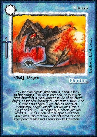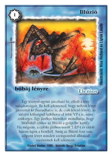 Szöveg: Egy lénnyel együtt játszható ki, elfedi a lény tulajdonságait. Be kell jelentened, hogy milyen lényt játszottál ki (hazudhatsz is, de csak létező lényt), az idézési költségnél költhetsz el több VP-t is, mint szükséges. Egy játékos bármikor mondhatja, hogy blöfföltél (ekkor az illúzió a gyűjtőbe kerül). Ha mégsem, a cáfoló játékos veszít 3 ÉP-t és eldob három lapot a kezéből. Amíg az illúzió fent van, célpont lényt minden szempontból állításod szerintinek kell tekinteni.