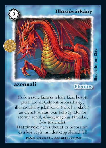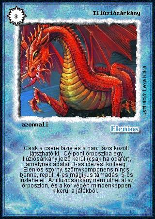 Szöveg: Csak a csere fázis és a harc fázis között játszható ki. Célpont őrposztba egy illúziósárkány jelző kerül (csak ha odafér), amelynek adatai: 3-as idézési költség, Elenios szörny, szörnykomponens nincs benne, repül, 4-es mágikus támadás, 5-ös tűzlehelet. Az illúziósárkány nem üthet át az őrposzton, és a kör végén mindenképpen kikerül a játékból.