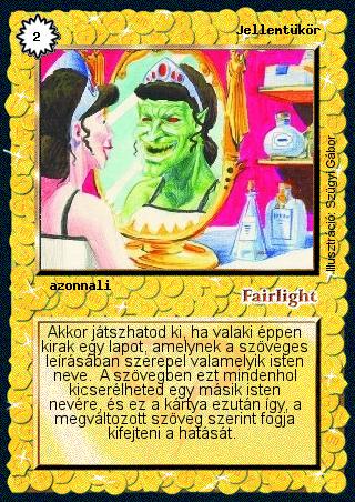Szöveg: Akkor játszhatod ki, ha valaki éppen kirak egy lapot, amelynek a szöveges leírásában szerepel valamelyik isten neve. A szövegben ezt mindenhol kicserélheted egy másik isten nevére, és ez a kártya ezután így, a megváltozott szöveg szerint fogja kifejteni a hatását.