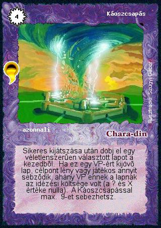 Szöveg: Sikeres kijátszása után dobj el egy véletlenszerűen választott lapot a kezedből. Ha ez egy VP-ért kijövő lap, célpont lény vagy játékos annyit sebződik, ahány VP ennek a lapnak az idézési költsége volt (a ? és X értéke nulla). A Káoszcsapással max. 9-et sebezhetsz.