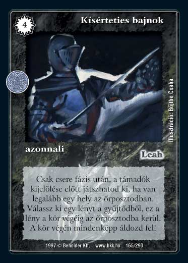 | (AK32) Ha Lady Olívia macskáját Kísérteties bajnokkal visszahozom, a kör végén a gyűjtőbe kerül, nem menti meg az életjelzője. A Kísérteties bajnokon ugyanis az szerepel, hogy az így megidézett lény kör végén mindenképpen a gyűjtőbe kerül. Az Ezüsthajnal szabálykönyvében már leírtuk, hogy ha egy lapon a "mindenképpen" szó szerepel, akkor azt semmilyen lap nem változtathatja meg, vagyis mindenképpen megtörténik. | | (AK33) Kísérteties bajnokkal nem hozhatok vissza Fair play mellett 6-nál nagyobb idézési költségű lényt, mivel a Kísérteties bajnok az őrposztba hozza vissza azt. | | (AK33) Kísérteties bajnokkal nem hozhatok vissza Fair play mellett 6-nál nagyobb idézési költségű lényt, mivel a Kísérteties bajnok az őrposztba hozza vissza. | | (AK33) A Kísérteties bajnokkal visszahozott lény a kör legvégén kerül a gyűjtőbe, azaz utána már nem lehet lapot kijátszani, így Haláltáncot sem. | | (AK35) Ha Kísérteties bajnokkal játékba hozok egy Óriás pöfeteget, a kör végén kapok kis gombákat, mivel a bajnok szövegében az szerepel, hogy az így visszahozott lény minden szempontból normális módon viselkedik. Az ilyen lényeknek minden speciális képessége működik. | | (AK36) A Kísérteties bajnokkal visszahozott lény minden szempontból normálisan viselkedik, kivéve, hogy a kör végén mindenképpen a gyűjtőbe kerül, de csak akkor, ha még az asztalon van. Ha valamilyen hatással (pl. A Gépezet) visszaveszem a kezembe, akkor már nem tud a gyűjtőbe kerülni. | | (AK38) A Megtestesülésnek kijátszási feltétele, hogy feláldozd X ÉP-det. A HKK-ban, a kijátszási feltételt mindig teljesíteni kell, amikor az adott lap bármilyen módon játékba kerül, kivéve, ha valamilyen lap határozottan az ellenkezőjét nem állítja. Tehát a Kísérteties bajnoknál is teljesíteni kell a kijátszási feltételt, és a Megtestesülés annyi per annyis lesz, ahány ÉP-t áldozok neki. Persze nem egy jó üzlet a Megtestesülést visszahozni a bajnokkal, mivel amikor a kör végén a gyűjtőbe kerül ismét sebződök annyit, mint amennyit áldoztam neki. | | (AK45) Az előkészítő fázisban nem lehet használni aktiválást kívánó speciális képességeket, de az állandó képességek működnek. A probléma abból adódik, hogy néha nehéz eldönteni egy képességről, hogy állandó vagy aktivizálást kívánó képesség. Általános szabály erre az, hogy azok a képességek kívánnak aktivizálást, amelyiknél szabadon dönthetek arról, hogy használom a képességet vagy nem. Értelemszerűen az összes olyan képesség, aminek költsége van, aktivizálást kívánó, mert ott mindig én döntök arról, hogy használom-e a képességet. A büntetés állandó képesség, mivel az tőlem függetlenül mindig kifejti hatását. A Romboló már egy vitatottabb eset, de amikor a gyűjtőbe kerül, nem kötelező célpontot választanom neki, így ez is aktivizálást kíván, ezért nem működik az előkészítő fázisban sem. Sőt a Kísérteties bajnokkal visszahozott Romboló sem szed le semmit, amikor visszamegy a gyűjtőbe, mivel az a kör legvégén történik, és utána már nem használhatok aktivizálást igénylő képességet. Ha a Romboló szövegében nem az szerepelne, hogy választhatok neki célpontot, hanem az, hogy ha a gyűjtőbe kerül mindenképpen leszed egy célpont lapot, akkor állandóan működő képességnek minősülne, és ekkor működne az előkészítő fázisban is. Persze ekkor a saját lapodat szedné le a saját rombolód, ha az ellenfélnek nem lenne lapja játékban. | | (AK54) Felhúzom a feláldozott A kalmárok italáért járó lapokat akkor is, ha az ellenfelem egy Talbot szavával válaszolt. A Talbot szavánál a kör legvégén, vagyis a gyógyulási fázis legvégén automatikusan megtörténő dolgok továbbra is végrehajtódnak. A lények, épületek felgyógyulnak, felhúzom a A kalmárok italáért járó lapokat, a Kísérteties bajnokkal visszahozott lény leesik stb. Viszont a gyógyulási fázis korábbi része, amikor még azonnali varázslatokat és hatásokat lehet használni, szintén elmarad, senki nem csinálhat semmit. | | (AK57) Mi történik akkor, ha Sir Lonil Zomarra Utolsó áldást játszok ki? És akkor, ha Kisebb Zannal másolom? Az Utolsó áldás esetében egyértelmű a kérdés. Sir Lonil Zomaron az olvasható, hogy sebzésen kívül semmilyen módon nem kerülhet a gyűjtőbe, az Utolsó áldáson pedig az, hogy a lény a kör végén a gyűjtőbe kerül. A két lap ellentmond egymásnak, ezért a Kronobogárnál felállított szabályt követjük: az asztalon maradó lap hatása mindig erősebb az egyszeri hatású lapénál. Vagyis Sir Lonil Zomar nem kerül a gyűjtőbe. Ha Kisebb Zannal másolom az már más helyzet, mert a zan egy asztalon maradó lap, annak ellenére, hogy a kör végén a gyűjtőbe kerül. Ekkor is a Kronobogár esetét lehet követni: ha két asztalon maradó lap ellentmond egymásnak, akkor a később játékba került lap szövege a mérvadó. Tehát a Kisebb Zannal másolt Sir Lonil Zomar a gyűjtőbe kerül a kör végén. Felvetették még a Kísérteties bajnok + Sir Lonil Zomar kombó kérdését is, itt azonban már az alapfelállás hibás, hiszen Sir Lonil Zomar csak kézből kerülhet játékba, Kísérteties bajnokkal ezért nem lehet visszahozni. | | (AK95) Az AK86 Kérdezz-felelek rovata alapján egy lap bármilyen módon történő játékba hozatala kijátszásnak minősül. Ezt a gondolatmenetet követve az Ősi béklyó mellett nem működhetne az Apró kívánság, és a hasonló előkereső/visszahozó lapok. Az Ősi béklyó azt mondja, hogy minden játékos körönként csak egy lapot játszhat ki. Itt azonban a kijátszás a kézből való kijátszásra vonatkozik, csak a fogalmazás picit pontatlan. Vagyis az Ősi béklyó mellett a kezedből kör