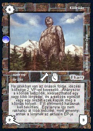 Szöveg: Ha játékban van az óriások földje, idézési költsége 2 VP-vel kevesebb. Ahányszor a kőóriás sebződik, kiválaszthatod egy vagy több lényedet, és a sebzés egészét vagy egy részét ezek kapják meg a kőóriás helyett. Ezt életmentő hatásnak kell tekinteni. Egy lényre így nem rakhatsz át több sebzést, mint amennyi annak a lénynek az aktuális ÉP-je.