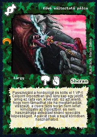 Szöveg: Passzivizáld a hordozóját és költs el 1 VP-t: Célpont őrposztban levő lény kap egy jelzőt, amíg ez rajta van, kővé vált. Ez azt jelenti, hogy nem támadhat (de ha megtámadják, visszaüt), a csere fázis során nem lehet kimozgatni az őrposztból, és nem használhatja aktiválást kívánó speciális képességeit. A pálcát csak a saját körödben használhatod.