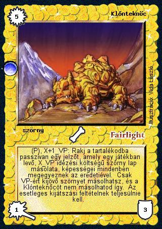 Szöveg: (P), X+1 VP: Rakj a tartalékodba passzívan egy jelzőt, amely egy játékban levő, X VP idézési költségű szörny lap másolata, képességei mindenben megegyeznek az eredetiével. Csak VP-ért kijövő szörnyet másolhatsz, és a Klónteknőcöt nem másolhatod így. Az esetleges kijátszási feltételnek teljesülnie kell.