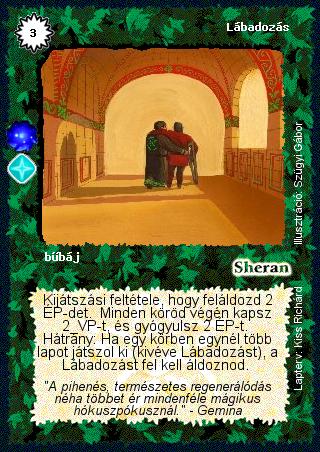 Szöveg: Kijátszási feltétele, hogy feláldozd 2 ÉP-det. Minden köröd végén kapsz 2 VP-t, és gyógyulsz 2 ÉP-t. Hátrány: Ha egy körben egynél több lapot játszol ki (kivéve Lábadozást), a Lábadozást fel kell áldoznod.