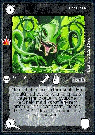 Szöveg: Nem lehet célpontja forrásnak. Ha megtámad egy lényt, a harci fázis végén mindketten a gyűjtőbe kerülnek, majd kapsz egy rém jelzőt (0/1-es Leah szörny, élőholt, (P), 2 VP, áldozd fel: célpont lény a gyűjtőbe kerül. ).